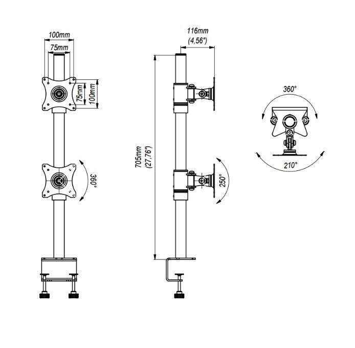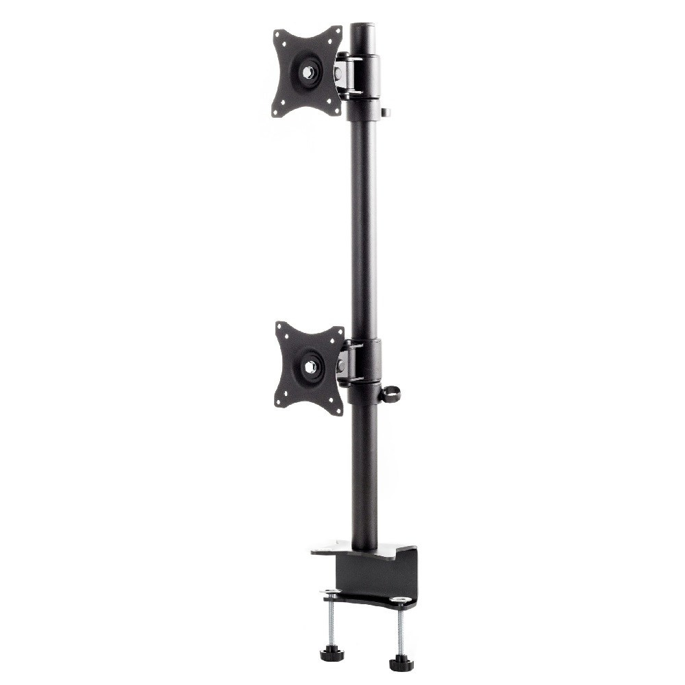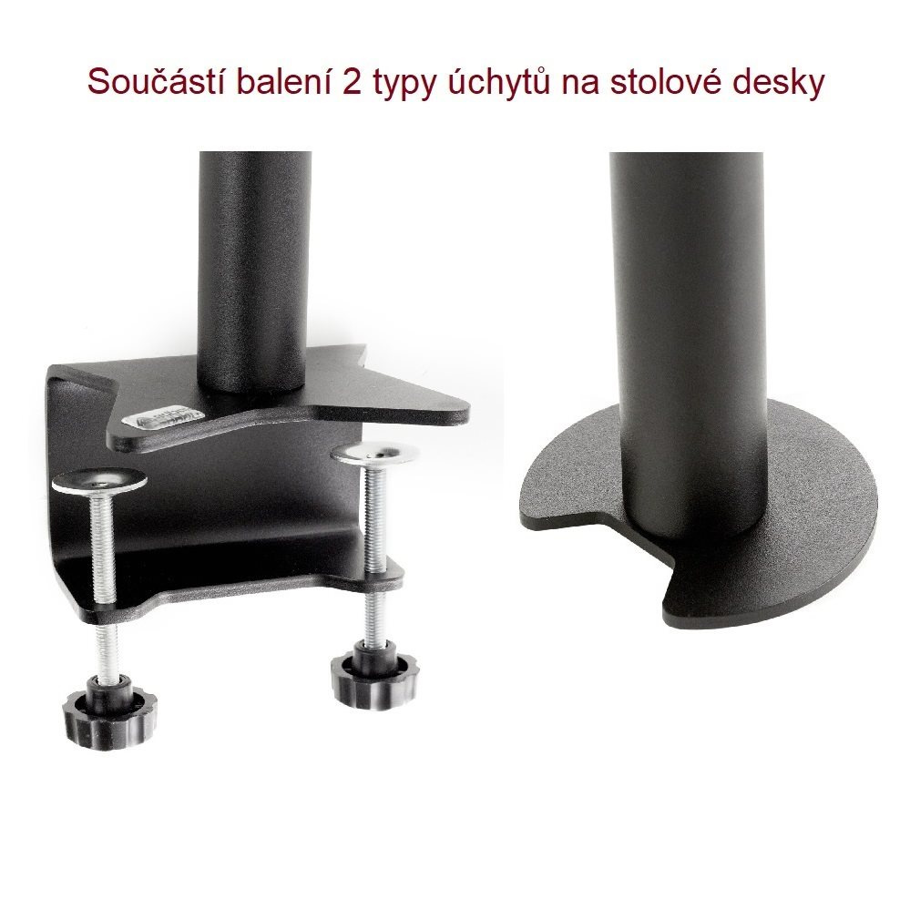Profesionální stolní držák na 2 monitory 15-30", VESA 75x75 a 100x100, otočný, sklopný, výškově polohovatelný, 2 typy stolního uchycení, barva černá, nosnost 20kg.Více