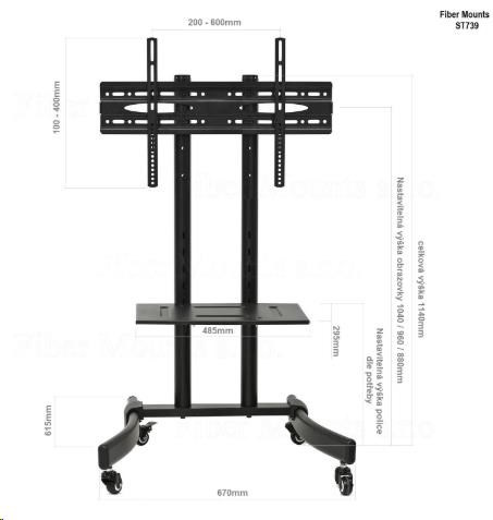 Technické údaje: maximální zatížení vozíku 40kg maximální zatížení police 5kg podpora VESA standardu 200x100 až 600x400 doporučená úhlopříčka televizoru 32" až 65" celková výška stojanu 1140mm stavitelná výška obrazovky ve 3 pozicích 104 / 96 / 88cm (výška po střed televizoru) police na příslušenství o rozměrech 485x295mm stavitelná výška police - možnost demontáže pevný, stabilní podstavec o rozměrech 670x615mm barevné provedení černé ekonomické balení o rozměrech 1060x350x120mm a hmotnosti 15kg záruka 2 roky Vozík na televizi Fiber Mounts ST739 podporuje VESA standardy: VESA 200x100 VESA 200x200 VESA 300x200 VESA 300x300 VESA 400x200 VESA 400x300 VESA 400x400 VESA 600x400. Fiber Mounts s.r.o., Nádražní 1296/4 69601 Rohatec Česká republika, mailto: info@drzakyastolky.cz