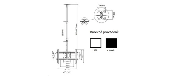 Technické údaje: maximální zatížení 68kg podpora VESA standardů 100x100 až 600x400 doporučená úhlopříčka obrazovky 32 až 60 palců nastavitelná délka 725-1500mm možnost náklonu obrazovky +5° až -15° dorovnání TV po montáži +/- 2° uchycení na strop nebo na stěnu - úchyt je možné přetočit o 90° otočný o +/- 30° vynikající kvalita moderní design barevné provedení černá záruka 5 let Držák podporuje VESA standardy: VESA 100x100 VESA 200x100 VESA 200x200 VESA 300x200 VESA 300x300 VESA 400x200 VESA 400x300 VESA 400x400 VESA 600x400.
