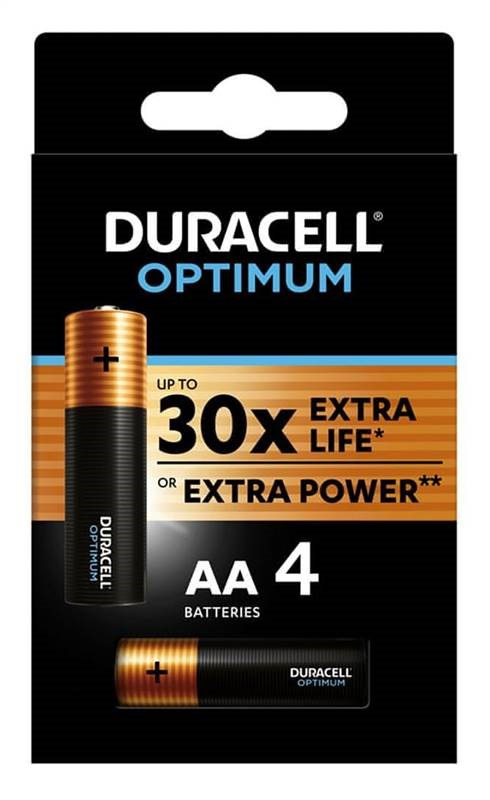 (BAL:4/64ks) Alkalické baterie Duracell Optimum AA (LR6) v balení po 4 kusech se hodí pro každodenní použití. Baterie se staly nezbytnou součástí každé domácnosti, kde napájejí mnoho elektronických zařízení, jako jsou hodiny, budíky, senzory, lampy, dálko
