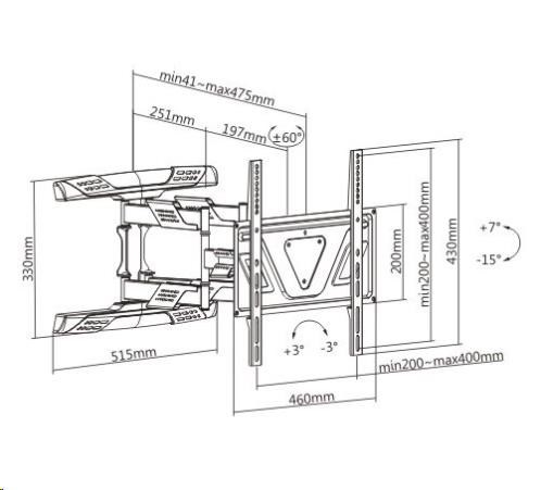 Špičkový nástěnný držák s polohováním Tv 32-80", otočný, sklopný, výsuvný Nástěnný držák na televize, který vyniká skvělou nastavitelností, výbornou konstrukcí a krásným dizajnem. Vhodný je na všechny typy a značky televizí, jejichž hmotnost není vyšší jak 45kg a které podporují VESA standardy od 200x200 do 400x400. Unikátní konstrukce držáku umožňuje zasunutí televize ke zdi na vzdálenost pouhých 41mm a maximální vysunutí až na vzdálenost 475mm. Otáčení je možné na obě strany minimálně o 60°, náklon je solidních 15° dolů nebo 7° nahoru. Držák podporuje korekci roviny obrazovky, konstrukce je osazena kryty pro vedení kabeláže. Držák Fiber Mounts Super-2 doporučujeme i náročným uživatelům, díky své kvalitě, dizajnu, nastavitelnosti, kvalitnímu zpracování a dostupné ceně je dostupný téměř každému. Fiber Mounts Super-2 je špičkový držák na televize 37-80" za skvělou cenu, vhodný nejen pro náročné uživatele Technické údaje: nosnost 45kg podpora VESA standardu 200x200 až 400x400 vhodný na televize s úhlopříčkou 32" až 80" výsuvný, nastavení vzdálenosti od zdi 41mm až 475mm otočný do stran, minimálně +/- 60° náklopný, směrem dolů až o 15°, nahoru až o 7° korekce roviny obrazovky +/- 3° ultra tenká, silnostěnná konstrukce vynikající bezpečnost a stabilita bez prověšení ramen i při maximálním zatížení a maximálním vysunutí krásný dizajn krytky pro vedení kabeláže barevné provedení černé záruka 5 let Nástěnný výsuvný ultraslim držák na Tv Fiber Mounts Super-2 podporuje VESA standardy: VESA 200x200 VESA 300x200 a 200x300 VESA 300x300 VESA 400x200 a 200x400 VESA 400x300 a 300x400 VESA 400x400.