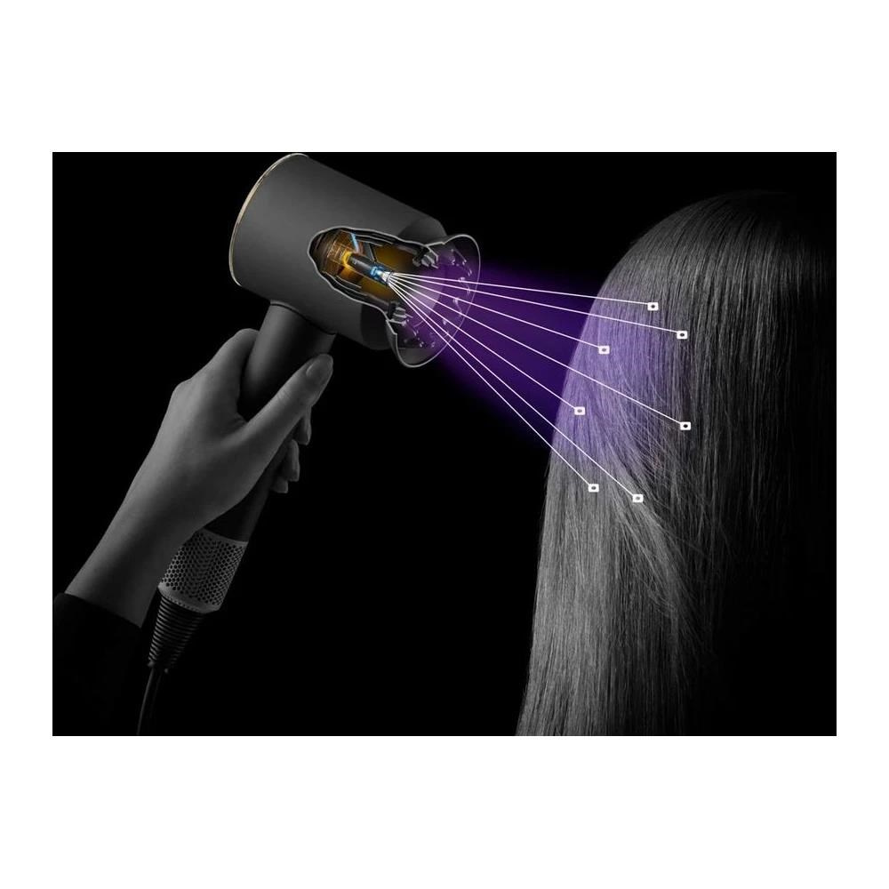 Fén nabízí 4 přesná nastavení teploty (100 °C, 80 °C, 60 °C, 28 °C) a 3 rychlosti pro rychlé, běžné či jemné vysoušení. Nechybí ani funkce rychlého zchlazení, která zafixuje účes. Výkonný digitální motor Dyson V9 a technologie Air Multiplier™ zaručují silný a rovnoměrný proud vzduchu.