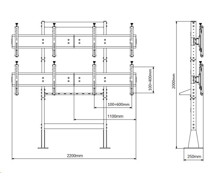 Technické údaje: maximální zatížení 210kg maximální hmotnost 1 monitoru nebo televizoru 50kg na televizory a monitory s úhlopříčkou 50÷57" zavěšení obrazovek v horizontální poloze podpora VESA standardu 100x100 ÷ 600x400mm výška televizní stěny 2000mm výškové nastavení každé řady monitorů dle potřeby posun monitorů do stran zajištění proti vysazení monitoru nutné ukotvení do podlahy profesionální televizní stěna nejvyšší kvality a zpracování snadné sestavení, rychlá montáž záruka 10 let Podporované VESA standardy: VESA 100x100 VESA 200x100 a 100x200 VESA 200x200 VESA 300x200 a 200x300 VESA 300x300 VESA 400x200 a 200x400 VESA 400x300 a 400x400 VESA 400x400 VESA 600x400. Fiber Mounts s.r.o., Nádražní 1296/4 69601 Rohatec Česká republika, mailto: info@drzakyastolky.cz