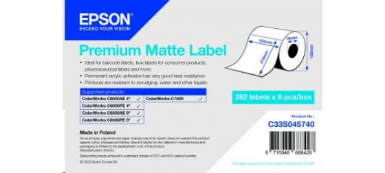 Epson label roll, normal paper, premium matt coated, fits for: Epson ColorWorks CW-C6000, Epson ColorWorks CW-C6500, Epson ColorWorks C7500, dimensions (WxH): 105x210mm, 282 labels/roll.