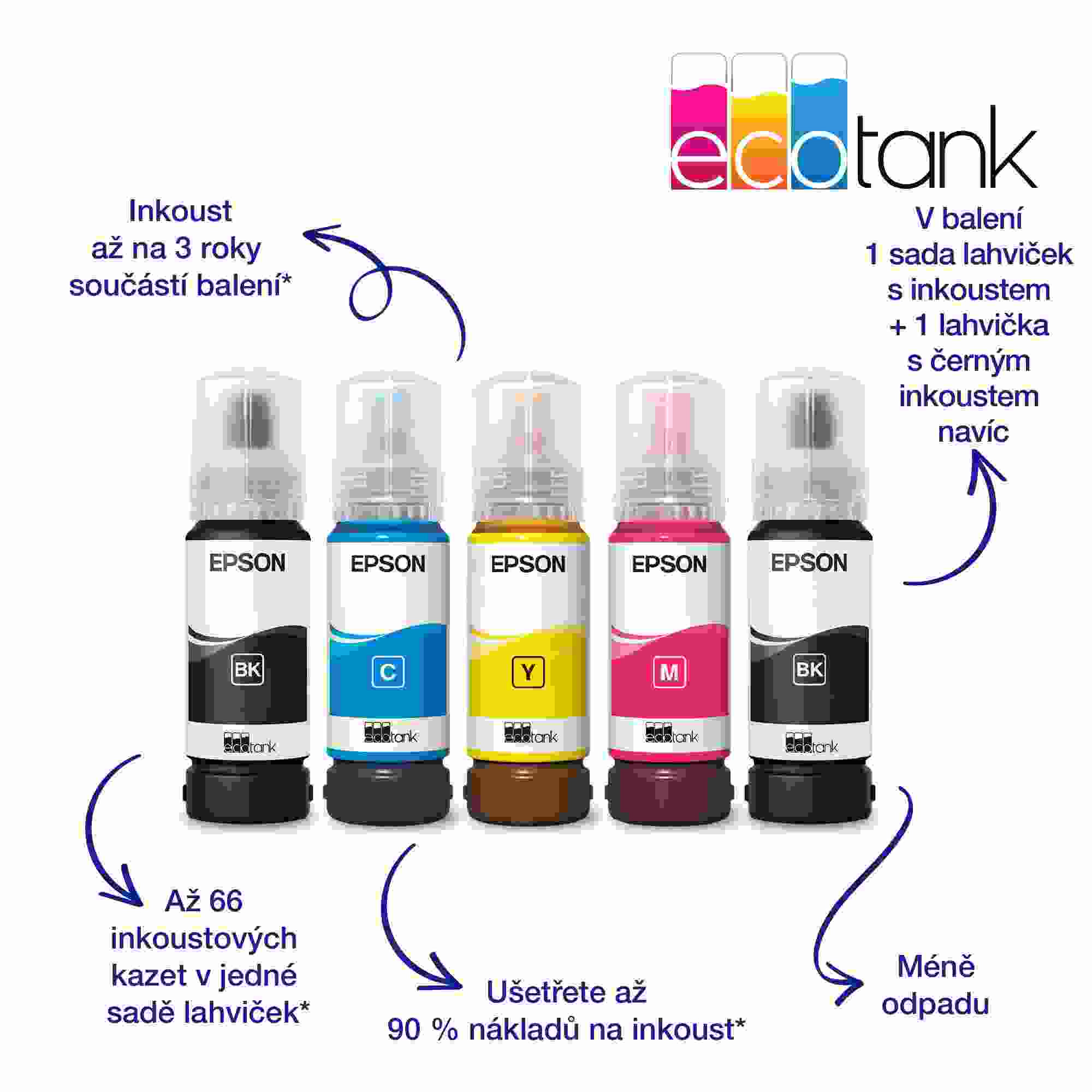 Tisková technologie:Inkoustový tankový systém; Maximální formát tisku/média:A4; Skutečné rozlišení tiskárny (v DPI):1440x5760; Rozhraní tiskárny:USB, Wi-Fi; Maximální rychlost tisku (A4 za minutu):33; Standardní počet vstupních zásobníků:1; Maximální počet vstupních zásobníků:1; Funkce:Barevný tisk, Bezokrajový tisk, Oddělené náplně.Více