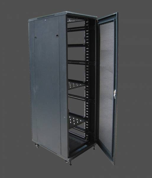 • Rozvaděč je standardně vybaven výškově přestavitelnými policemi (3ks pro 42U), panelem se zásuvkami 230V, ventilační jednotkou a sadou spojovacího materiálu. Plechové uzamykatelné dveře na přední i zadní stěně. Odnímatelné boční kryty s možností montáže zámku. Dodáváno v rozloženém stavu.