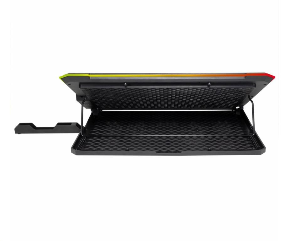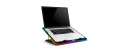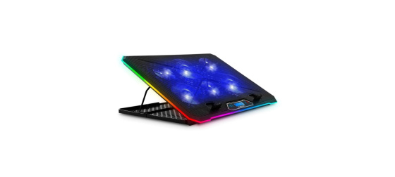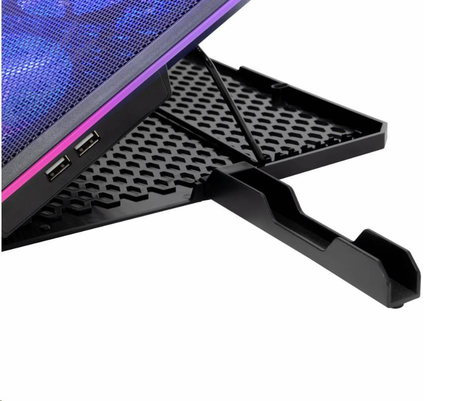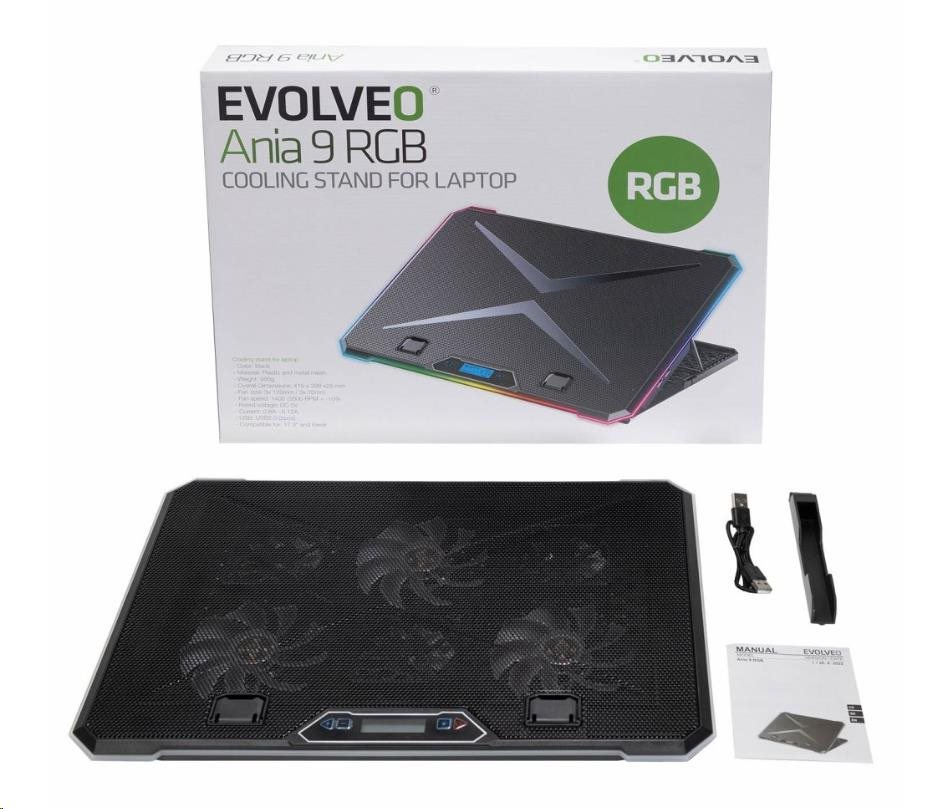 Chladicí podložku EVOLVEO Ania 9 RGB s RGB podsvícením využijete pro notebooky o velikosti 10-17". Bezesporu oceníte možnosti nastavení polohy a regulaci otáček ventilátoru. Pomocí tlačítek u displeje lze přepínat mezi třemi barevnými módy (modrá, zelená a červená) a čtyřmi RGB módy, které osvětlují okraj podložky. Podržením tlačítka pro ovládání barevných módů podobu delší 3s dojde k zapnutí/vypnutí LED na okraji podložky. Tlačítkem pro regulaci otáček lze navolit jednu ze 4 rychlostí ventilátorů a tyto pak zcela vypnout.