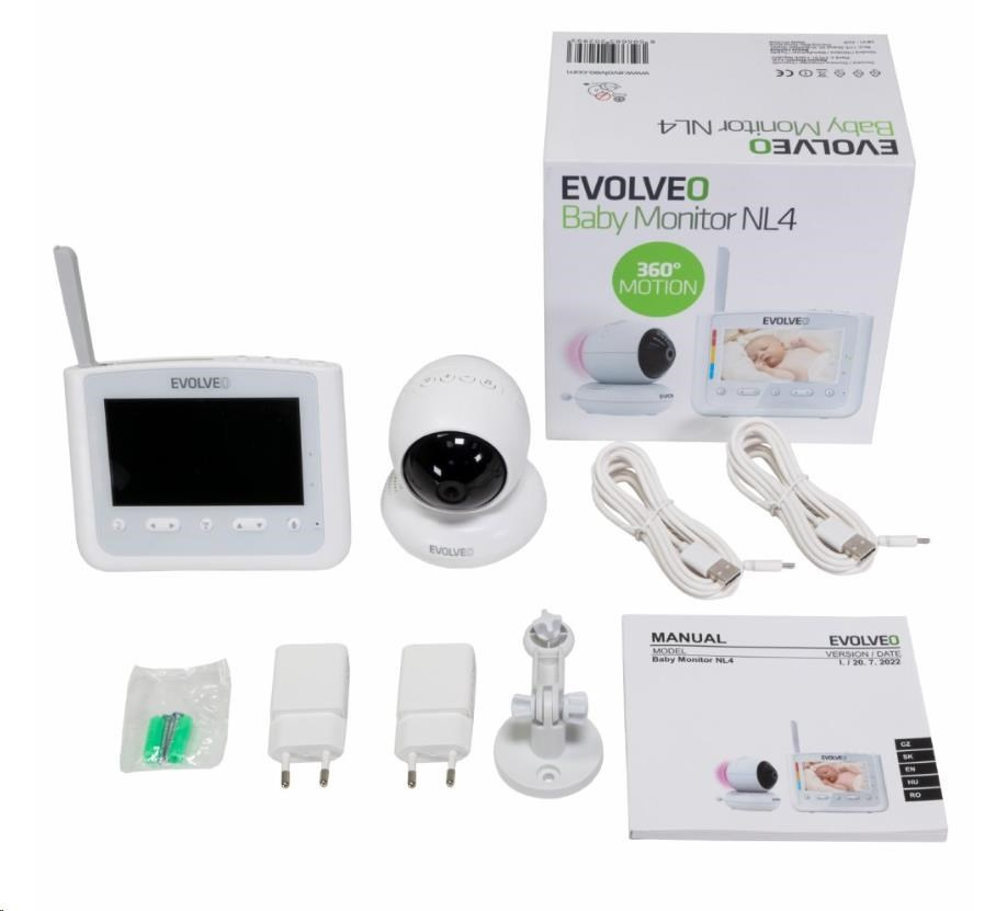 | Obsah balení | 1x Rodičovská jednotka s diplejem 1x otočná kamera 2x napájecí adaptér 2x USB-C kabel 1x držák + sada na upevnění 1x Uživatelský manuál |