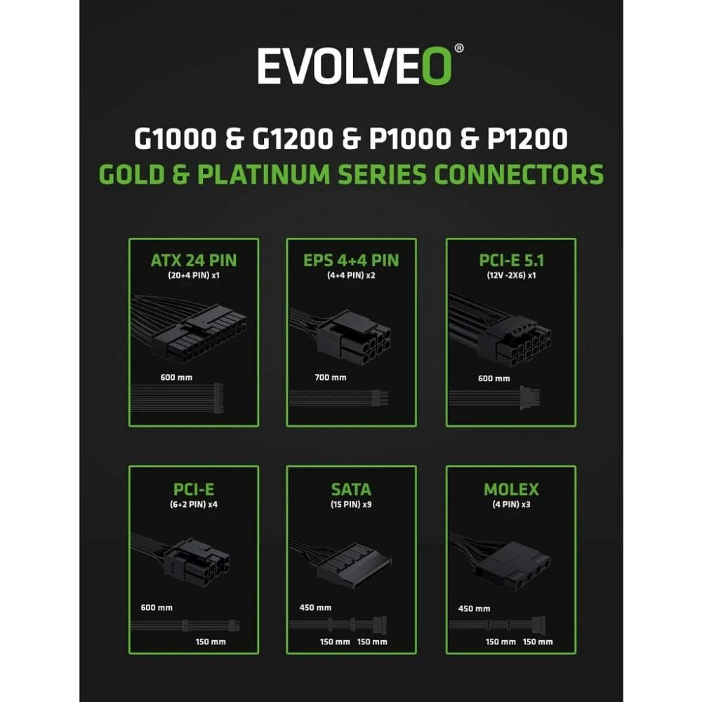 Zapomeňte na zamotané kabely, které brání proudění vzduchu a ještě vaší počítačové skříni kazí styl. Zdroj EVOLVEO G1000 je plně modulární, takže k němu připojíte jen ty kabely, které opravdu potřebujete. Součástí balení jsou všechny důležité šňůry – jeden kabel ATX 24 PIN, dva EPS 4+4 PIN, dva PCI-E 6+2 PIN, jeden PCI-E 5.1 12V-2×6, tři SATA a jeden MOLEX. Díky tomu máte místo na vše od CPU a GPU přes disky až po vymazlené LED pásky či jiné extra prvky.