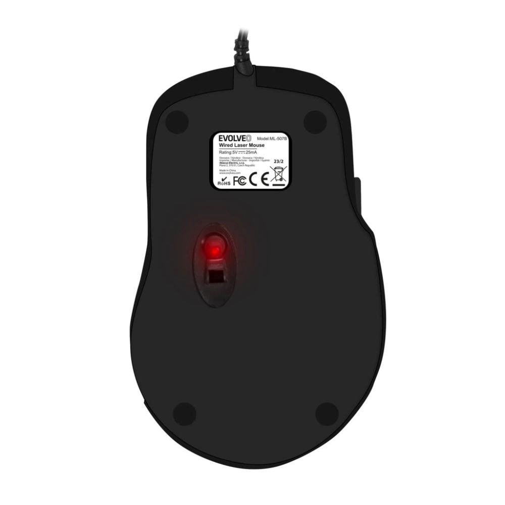 Laserová myš LASERWIRE ML-507B standartní velikosti, ergonomicky tvarovaná v praktické černé barvě. Skvělá pro běžnou práci diky rozlišeni 1600DPI a 5 tlačitkům.