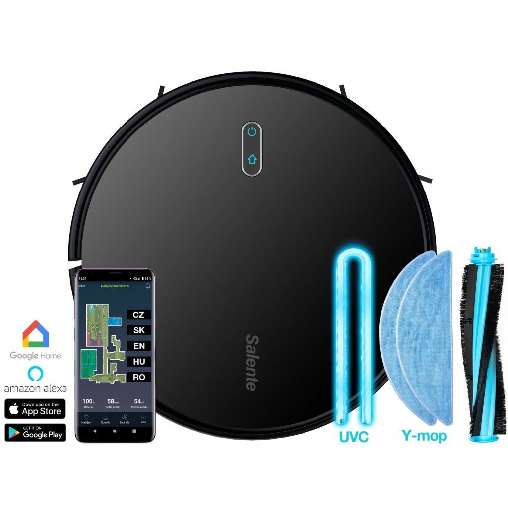 Salente G4 je schopen vaši podlahu vysávat, vytírat a desinfikovat pomocí vestavěné UVC lampy současně. Pomocí SMART gyroskopické navigace a snadné kontroly uklízeného prostoru pomocí mobilní aplikace v českém jazyce dokáže snadno, rychle a kvalitně uklidit váš členitý byt nebo dům a po ukončení úklidu se vrátit zpět do nabíjecí základny.