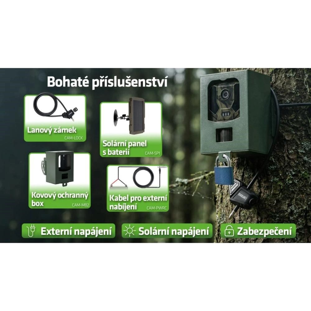 EVOLVEO StrongVision PRO 4G II je navržena jako skutečně univerzální fotopast, která najde uplatnění při sledování volně žijící zvěře, ochraně majetku, střežení objektů i kontrole vzdálených lokalit bez dostupného elektrického napájení. Díky podpoře originálního příslušenství EVOLVEO se snadno přizpůsobí konkrétním podmínkám instalace. Pro zvýšení zabezpečení je k dispozici EVOLVEO StrongVision MB2 kovový box, který chrání fotopast proti vandalismu i nepříznivému počasí. Pro rozšíření možností napájení lze využít EVOLVEO StrongVision PWRC napájecí kabel pro připojení externí baterie nebo EVOLVEO StrongVision SP1 solární panel s integrovanou baterií, který umožňuje dlouhodobý až bezobslužný provoz v terénu. Součástí balení je vyměnitelný akumulátor EVOLVEO StrongVision BAT2 s kapacitou 10 000 mAh, vybavený integrovaným USB-C portem a DC jackem, díky čemuž jej lze pohodlně nabíjet i mimo fotopast. Možnost rychlé výměny akumulátoru bez nutnosti demontáže zařízení výrazně zvyšuje komfort při dlouhodobém provozu v terénu.