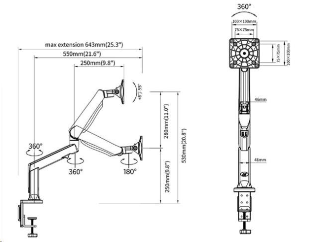 Profesionální stolový plně polohovatelný držák na monitory a televizory s úhlopříčkou 17-32" Nabízíme Vám špičkový držák na televizi nebo monitor s uchycením na stolovou desku, který je plně polohovatelný - otáčení do stran, nastavení náklonu, výšky a vzdálenosti od uchycení, otáčení obrazovky do horizontální nebo vertikální polohy. Držák je ideální pro zavěšení všech typů televizorů a monitorů s úhlopříčkou 17-32" a hmotností maximálně 8kg. Nastavení výšky umožňuje plynová pružina, kterou snadno nastavíte na hmotnost 2-8kg. Polohování obrazovky je velmi snadné a příjemné, zvládnou to i děti. Držák má systém pro vedení kabeláže a připojení USB portů. Barevné provedení černé. Záruka 3 roky. Technické údaje: nosnost 8kg minimální zatížení 2kg držák podporuje VESA standardy 75x75 a 100x100 možnost zakoupení rozšíření na VESA 200x100 nebo 200x200 ideální pro zavěšení monitorů a televizorů s úhlopříčkou 17-32" otáčení do stran +/- 180° náklon + 55° až - 8° funkce PIVOT - otočení obrazovky na délku nebo na výšku (horizontálně nebo vertikálně) nastavení vzdálenosti od uchycení na stolovou desku max. 643mm výškové polohování 280mm minimální výška od stolu 250mm maximální výška od stolu 530mm systém vedení kabeláže 2x USB port 2 typy uchycení na stolovou desku (na okraj, do prostoru) uchycení na stolové desky o síle 10-95mm profesionální kvalita barevné provedení černé záruka 3 roky. Fiber Mounts s.r.o., Nádražní 1296/4 69601 Rohatec Česká republika, mailto: info@drzakyastolky.cz