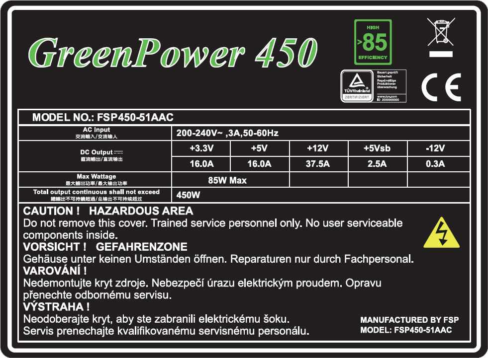 Popis Fortron zdroj 450W GreenPower 450-51AAC, 80+ Bronze