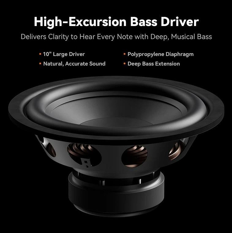 Aktivní subwoofer s 10" down-firing basovým reproduktorem, 200W Class-D zesilovač (špičkově až 500 W). Dvojité zadní bass-reflex porty, tuhá 14kg konstrukce. Vstupy: RCA a LFE. RCA výstup pro propojení dalšího subwooferu, nastavitelná fáze 0°–180°, crossover 40–180 Hz, dva DSP EQ režimy. Rozměry 36 × 36 × 40 cm. Součást balení: napájecí kabel 1,8 m, uživatelský manuál.. NoName není konkrétní značka nebo výrobce, ale spíše označení pro generické produkty, které nejsou spojeny s konkrétní známou značkou. Dodavatel: eD system a.s., Novoveská 1262/95, 709 00 Ostrava - Mariánské Hory, CZ