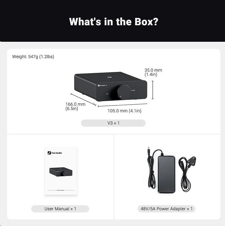 Kompaktní stereo zesilovač osazen prémiovými součástkami, čip Texas Instruments TPA3255, výkon až 2x 300W @ 4?. THD 0,003 %, SNR ? 110 dB. RCA vstup, výstup pre-out, frekvenční rozsah 20 Hz – 20 kHz (±0,1 dB), impedance 2–8 ?. Rozměry: 165 × 104 × 36 mm, napájení DC 48 V. Součástí balení: napájecí adaptér, uživatelský manuál..