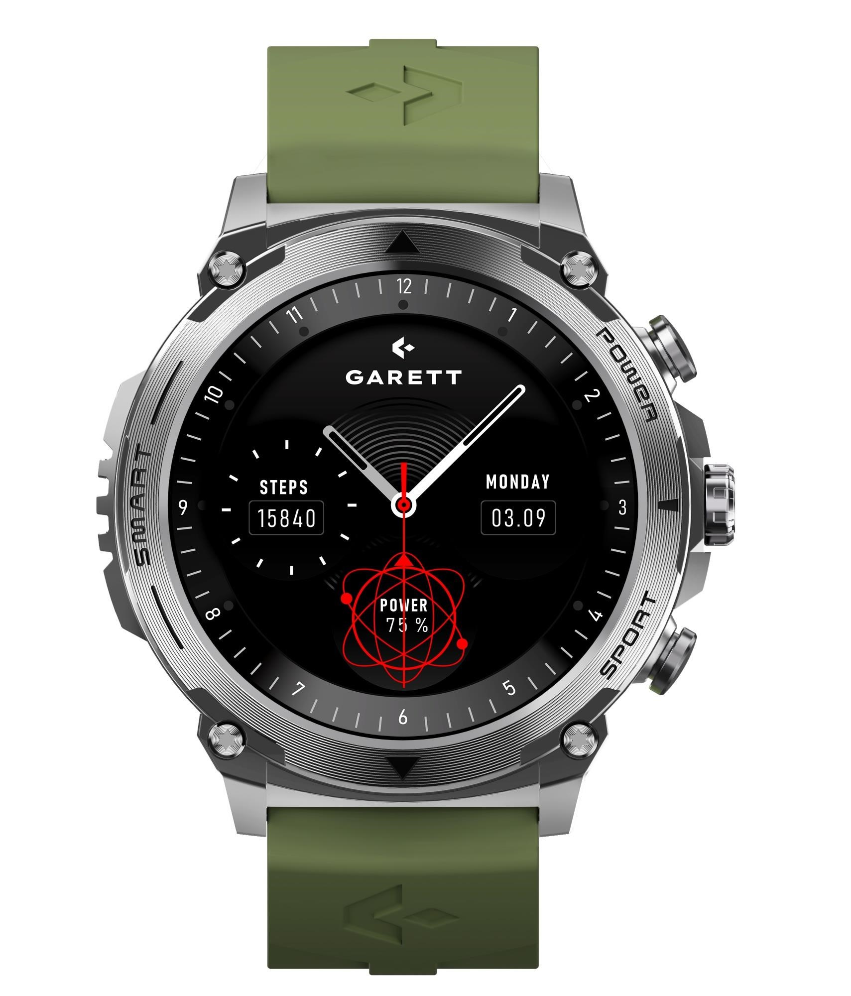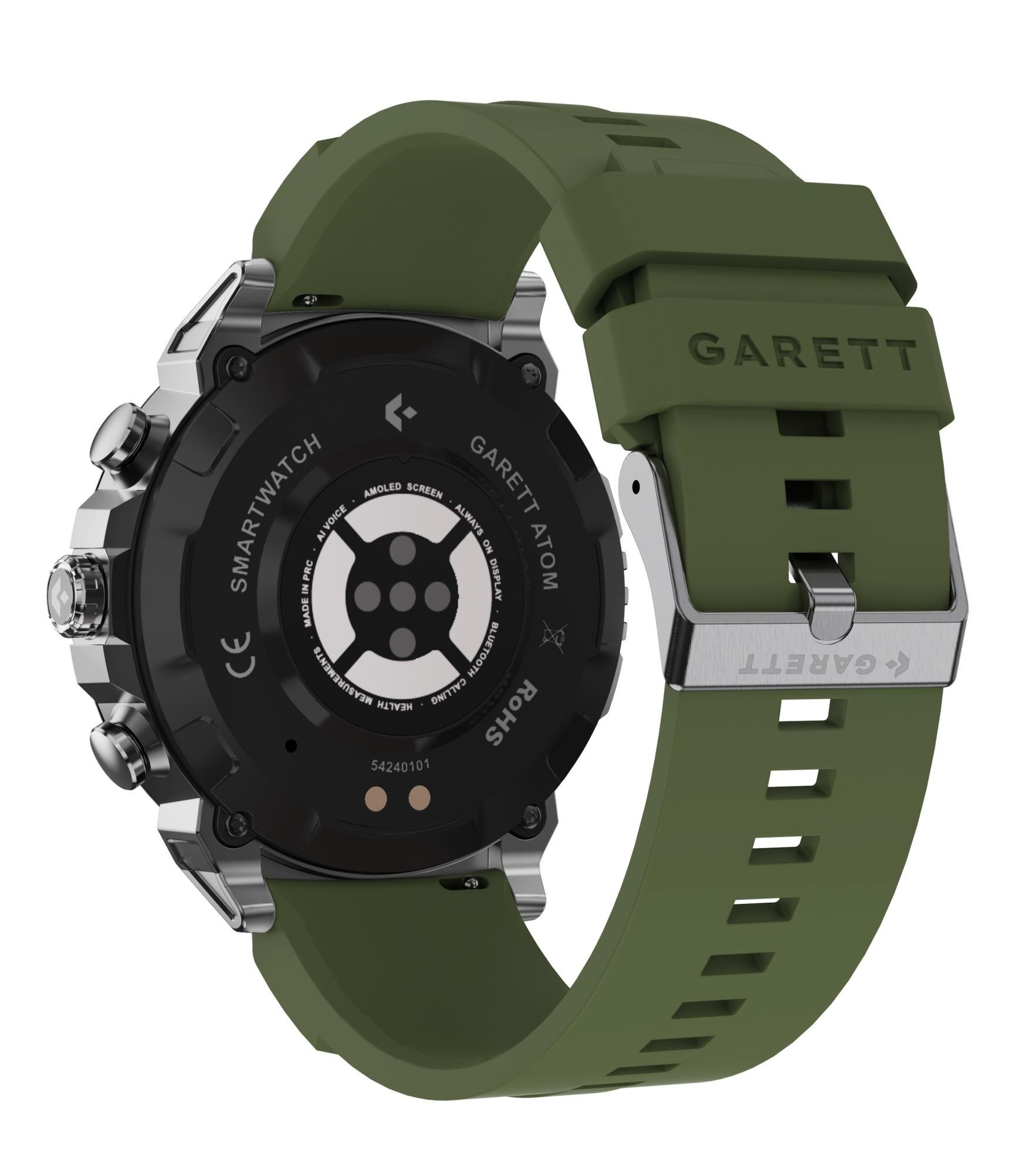 Garett Atom Silver Steel kombinuje elegantní design s pokročilými funkcemi. Je vybaven 1,43" AMOLED displejem s rozlišením 466 × 466 px a funkcí Always On Display. Díky Bluetooth 5.2 umožňuje přijímání a uskutečňování hovorů přímo ze zápěstí. Hodinky monitorují srdeční tep, krevní tlak, saturaci kyslíkem, spánek a stres. Nabízí více než 100 sportovních režimů a výdrž baterie až 8 dní při běžném používání. V balení je ocelový náramek, silikonový pásek a nástroj pro úpravu délky náramku.