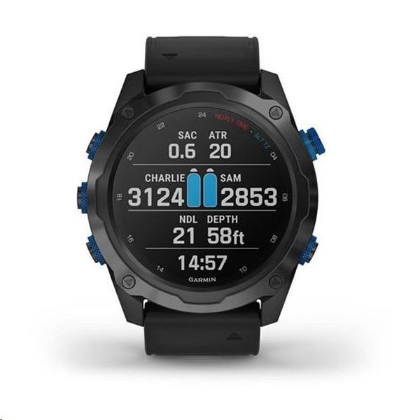 Potápěčský počítač se sonarovou technologií SubWave a s funkcemi chytrých a sportovně všestranných GPS hodinek, s mapami, MP3 hudbou a bezkontaktními platbami Garmin Pay. Safírové sklo, titanová luneta s DLC povrchovou úpravou, silikonový řemínek