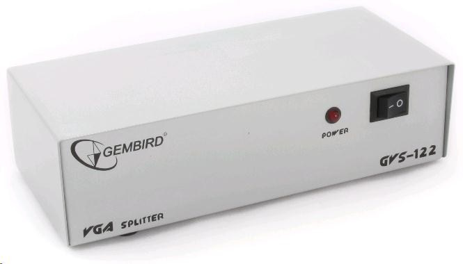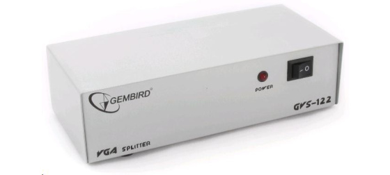Posílá video signál z jednoho počítače na dva monitory. GVS122 VGA multiplier Sends PC video output to 2 monitors 1 input HD DB15 female connector 2 output HD DB15 female connectors Resolution: up to 2048x1536 pixels Horizontal sync frequency range: 30-200 KHz Vertical sync refresh range: 43-150 HZ Bandwidth: 200MHz at -3dB Power supply adapter: DC 7V 500mA, 2 mm center pin Dimensions L x W x H, mm: 191x85x55. Gembird Europe BV, Wittevrouwen 56, 1358CD Almere, Nizozemsko, postmaster@gmb.nl
