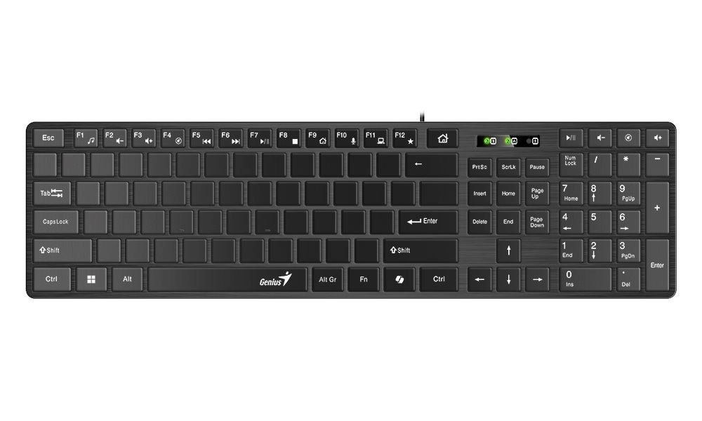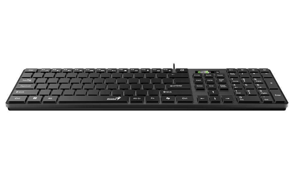 Elegantní drátová klávesnice v černém provedení disponuje tenkým profilem a komfortním jemným sklonem. Díky tomu poskytuje uživateli maximální pohodlí při každodenní práci. Předností jsou také multimediální klávesy pro ztlumení zvuku, otevření e-mailu apod. Klávesnice má speciální layout bez popisků na klávesách a je tak vhodná pro výuku desetiprstové hmatové metody psaní. Je vybavena samostatnou klávesou pro vyvolání AI asistenta Microsoft Copilot v systému Windows. Připojení k počítači je realizováno skrze USB port.