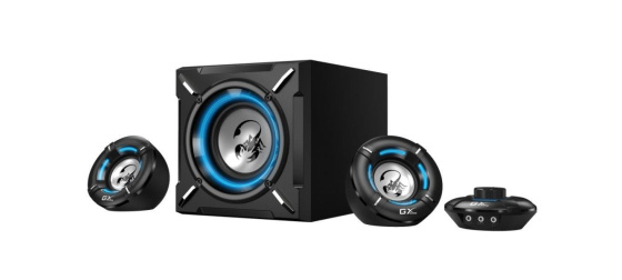 Designové herní reproduktory v konfiguraci 2.1 s celkovým výkonem 26 W. Přítomný zesilovač disponuje ovládáním hlasitosti, díky kterému si můžete užít hlasitý zvuk dle libosti, sluchátkovým výstupem a vstupem pro mikrofon. Herní design doplňuje modré podsvícení.