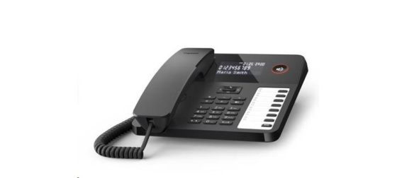 Šňůrový telefon Gigaset DESK 600 s LCD displejem a sedmi klávesami přímé volby, každou se dvěma přiřazenými čísly, je ideální pro použití doma nebo v kanceláři.