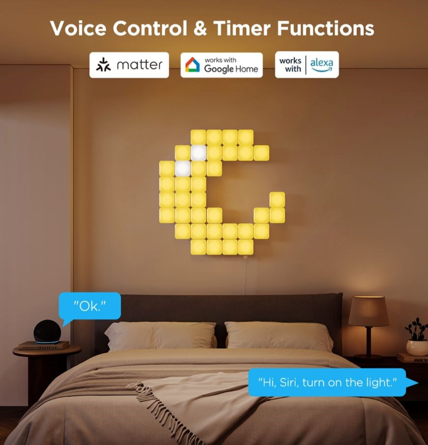 Užijte si pohodlí chytrého ovládání díky kompatibilitě s Matter, Google Home, Amazon Alexa a Siri. Stačí jediný hlasový příkaz, a vaše Govee Mini Panel Lights se přizpůsobí přesně vašim potřebám – ať už jde o zapnutí, změnu barev nebo nastavení intenzity. S funkcí časovače můžete snadno naplánovat osvětlení podle vašeho denního rytmu a vytvořit ideální atmosféru kdykoliv.