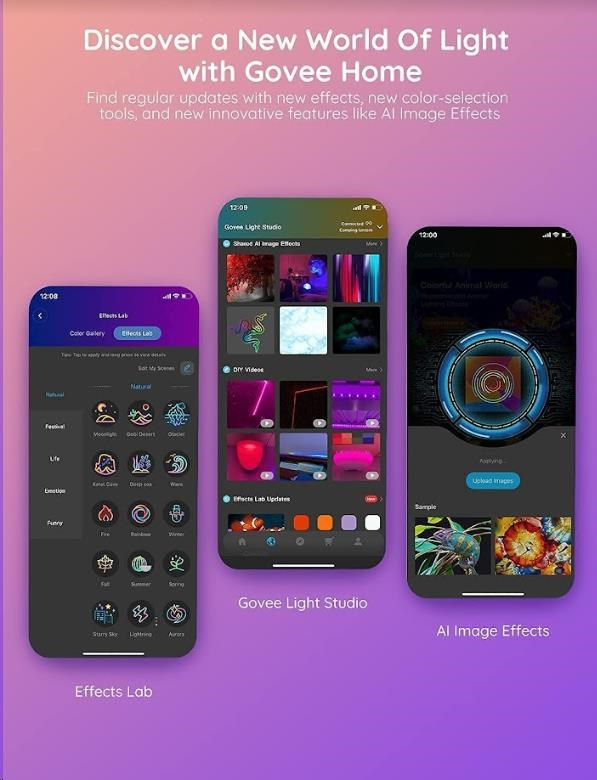 Spravujte nastavení barev a intenzity světla jednoduše pomocí aplikace Govee Home. Aplikace je zdarma ke stažení v Google Play a AppStore. Navíc získáte přístup k funkci časovače, DIY barvám, režimu videa, synchronizaci hudby a režimům scény. Rovněž si můžete pomocí časovače nastavit automatické vypnutí a zapnutí, třeba podle doby usínání a vstávaní. Ovládání hlasem je možné přes Siri, Amazon Alexa a Google Assistant.