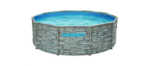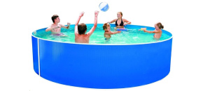 Kulatý nadzemní bazén Planet Pool s bílou ocelovou stěnou (0,3 mm) a modrou UV stabilizovanou PVC fólií (0,2 mm). Určen pro celoroční použití, rozměry 350 x 90 cm. Odolný vůči mrazu a povětrnostním vlivům.