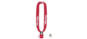Zpevněný ocelový řetěz s ocelovým visacím zámkem je 90 cm dlouhý a obsahuje ocelové spojky o průměru 6 mm, které odolávají řezání. Nylonový kryt zabraňuje poškrábání. 2 ks klíčů jsou součástí balení. Barva červená. Cena za kus..