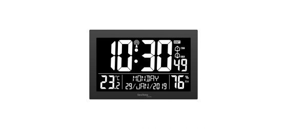 Digitální nástěnné hodiny s dvěma budíky s inverzním LCD displejem, časem řízeným rádiovým signálem DCF-77 a měřením vnitřní teploty a relativní vlhkosti • nástěnné hodiny s možností postavení • velikost inverzního displeje 110 x 194 mm • čas řízený rádiovým signálem DCF-77 • formát zobrazení času 12, nebo 24 hodin • datum s názvem dne (jazyk EN, DE, FR, IT, ES, NL a DK) • 2 budíky - pro pracovní dny a víkend • funkce opakovaného buzení (Snooze) s nastavitelným časem od 5 do 60 minut • buzení zvukovým signálem ( 20 sekund 1 pípnutí za sekundu, poté 20 sekund 2 pípnutí za sekundu, poté 20 sekund 4 pípnutí za sekundu a poté stálé pípání) • datum • časová zóna od -2 do +2 hodin • měření vnitřní teploty a relativní vlhkosti • ikona slabých záložních baterií • napájení na síťový adaptér a záložní baterie • barva černá. TechnoTrade Import-Export GmbH, Gewerbepark Berlin-Wildau 10 15745 Wildau Německo, info@technotrade-berlin.de
