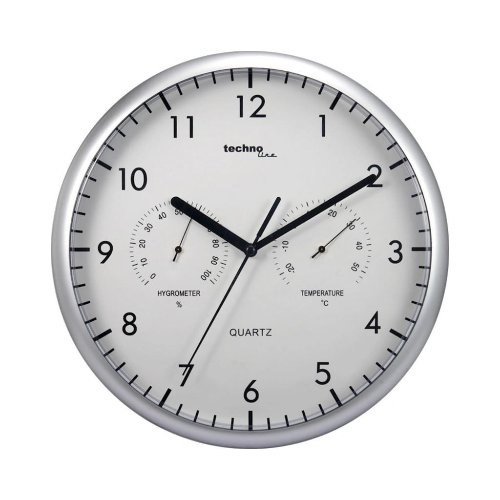 TechnoLine WT 650 – analogové nástěnné hodiny s bílým ciferníkem, černými číslicemi a dvěma doplňkovými ciferníky pro teplotu a vlhkost. Elegantní plastové provedení s průměrem ciferníku 230 mm.Více