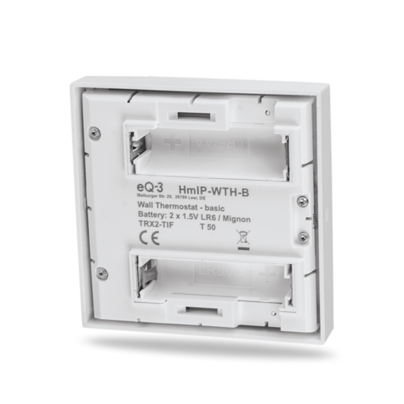 Bezdrátový Nástěnný termostat Basic (HmIP-WTH-B) z řady Homematic IP umožňuje časově řízenou regulaci teploty v místnosti ve spojení s termostatickými hlavicemi (HmIP-eTRV) z řady Homematic IP nebo Akčními členy podlahového vytápění (HmIP-FAL).