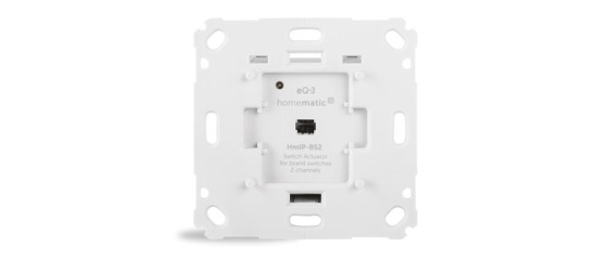 Programovatelný bezdrátový Spínací akční člen dvoukanálový (HmIP-BS2) pro zápustnou montáž, napájený ze sítě 230 V, je součástí systému chytré domácnosti Homematic IP.