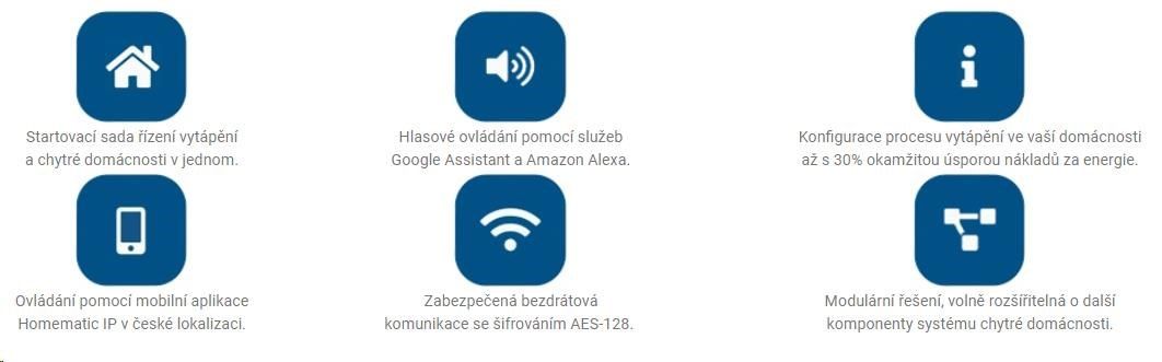 Startovací sada pro řízení vytápění HmIP-SET4 určená pro počáteční integraci chytré domácnosti Homematic IP. Sada obsahuje tři základních prvky pro spolehlivé řešení regulace vytápění a vzdálené řízení prostorové teploty v místnosti dle individuálních potřeb, což vede k okamžité úspoře a snížení výdajů na energie až o 30 %. Sada obsahuje Centrální jednotku HmIP-HAP, 2x Termostatickou hlavici HmIP-eTRV-E a bezplatnou mobilní aplikaci v CZ lokalizaci dostupnou pro operační systém Android a iOS.