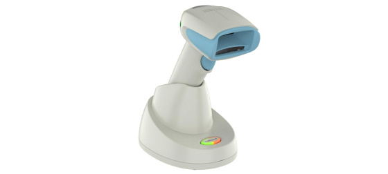Bluetooth scanner, healthcare, 2D, imager (high density), desinfectable housing, incl.: cable (USB, straight, 3 m, black), charging/transmitter cradle (presentation), battery, 2400 mAh, colour: white.