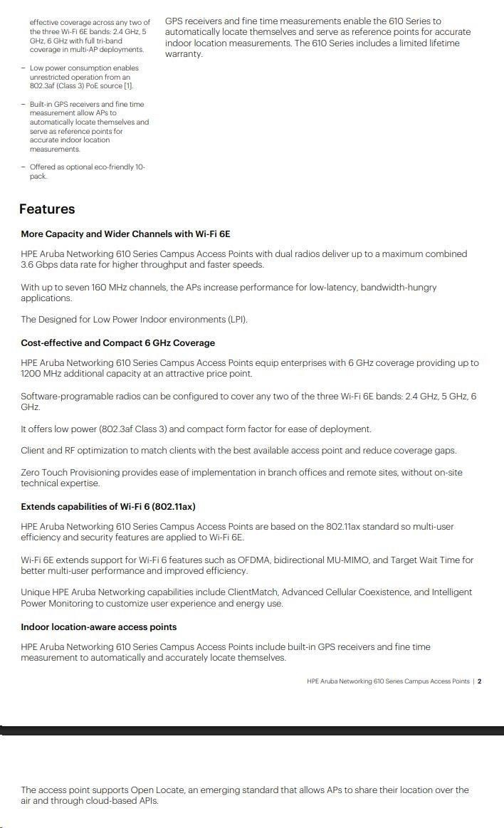 | Summary Aruba 610 Series Access Points are designed to take advantage of the 6 GHz band using two radios that can deliver comprehensive tri-band coverage in a multi-AP environment and better meet the growing demands of Wi-Fi due to increased use of video, growth in client and IoT devices, and expanded use of cloud. With a 3.6 Gbps combined peak data rate for higher throughput and faster speeds for indoor use, the Aruba 610 Series delivers a cost-effective enterprise Wi-Fi 6E solution with increased capacity, wider channels, reduced power consumption. |