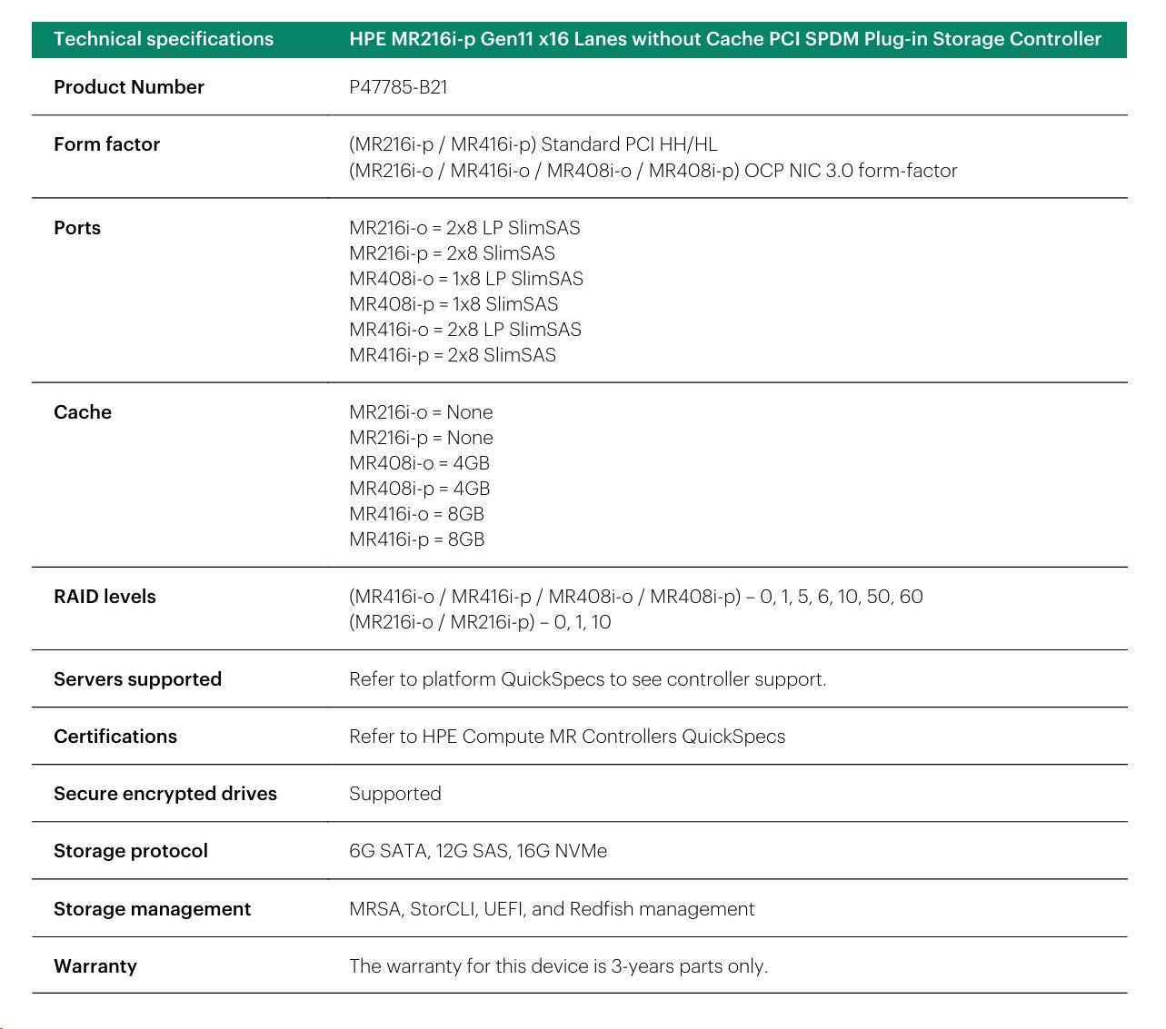 HPE MR216i-p Gen11 16 Internal Lanes/No Cache SPDM PCI Plug-in Storage Controller (raid 0,1,10 only)