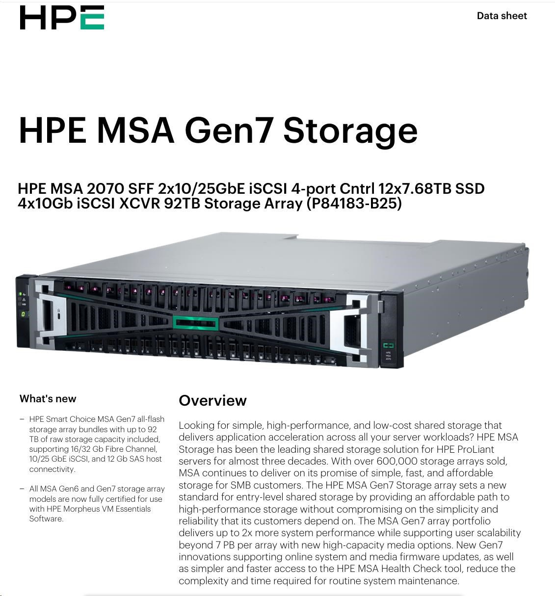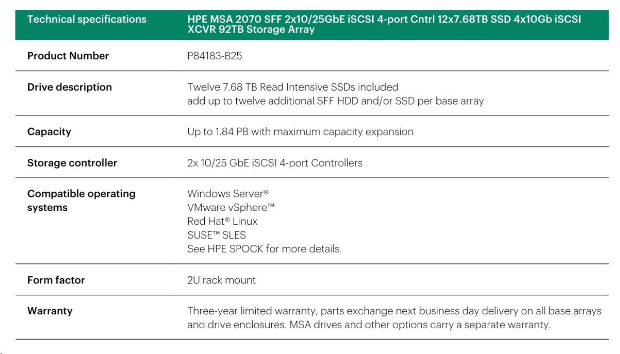 HPE MSA 2070 SFF 2x10/25GbE iSCSI 4pController 12x7.68TB SSD 4x10Gb iSCSI XCVR(4xC8R25B) 92TB Storage Array Smart Choice