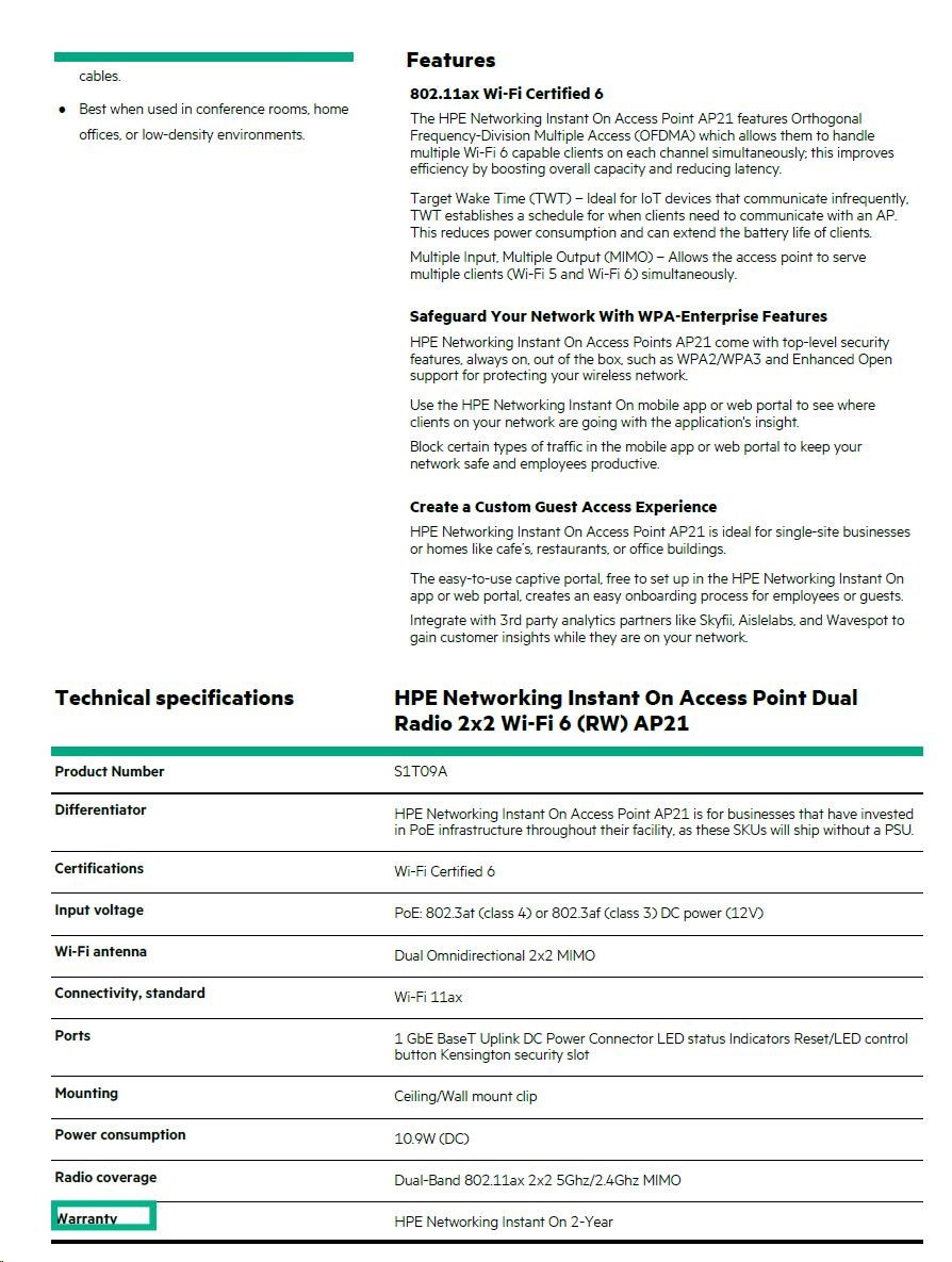 - The HPE Networking Instant On Access Point AP21 is a dual radio indoor access point designed to bring connectivity to small spaces. This Wi-Fi CERTIFIED™ 6 access point offers modern WI-Fi standards in a small footprint to enhance the connectivity of your network for up to 50 devices. The dual-band radios offer suitable range for a 1500 sq ft space at an affordable price with the same features as other more costly access points. The HPE Networking Instant On AP21 can also be used with Smart Mesh with any other Instant On access point to extend your network coverage without needing to run new cables—HPE Networking Instant On AP21, small yet mighty coverage for your growing wireless needs.