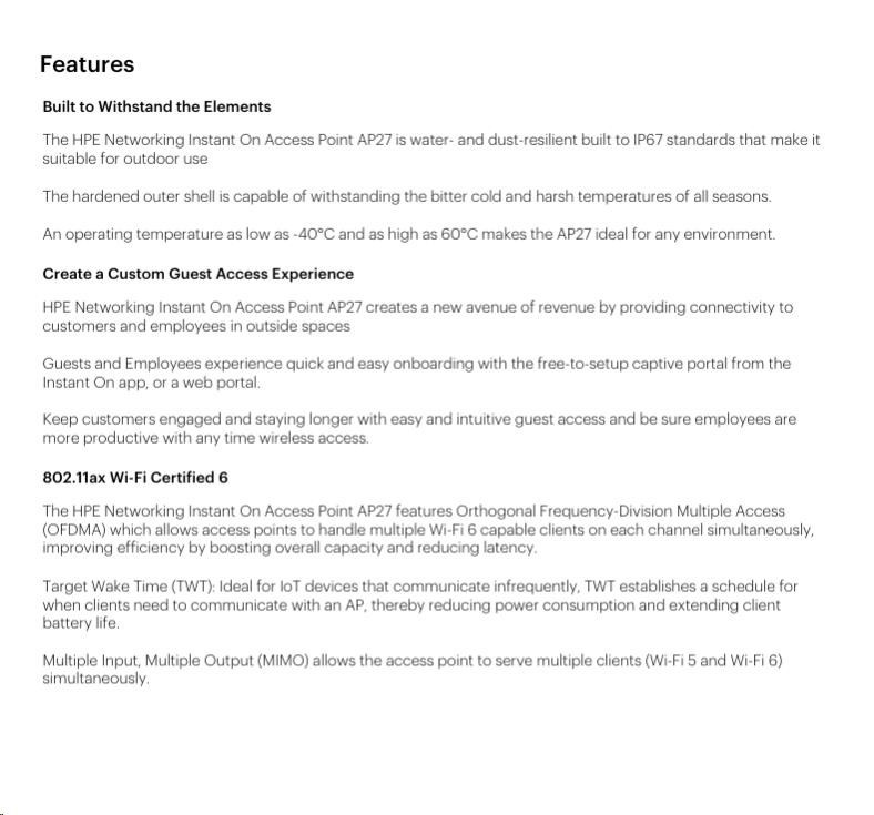 HPE Networking Instant On Access Point AP27 je dvoupásmový venkovní přístupový bod navržený tak, aby udržel vaše zaměstnance a zákazníky produktivní i venku. Tento přístupový bod s certifikací Wi-Fi CERTIFIED 6™ podporuje až 75 současně připojených uživatelů a nabízí moderní standardy Wi-Fi v robustním a odolném provedení. Tyto dvoupásmové všesměrové antény poskytují působivý dosah a stejné funkce jako jiné podnikové přístupové body, ale bez jakýchkoli průběžných poplatků za předplatné. AP27 je vybaven integrovanými držáky pro montáž na zeď nebo stožár v odolném krytu pro flexibilní instalace ve venkovních prostředích. AP27 nabízí napájení přes Ethernet (PoE) 802.3af (třída 4) s plně integrovanou správou prostřednictvím mobilní aplikace Instant On nebo webového portálu.