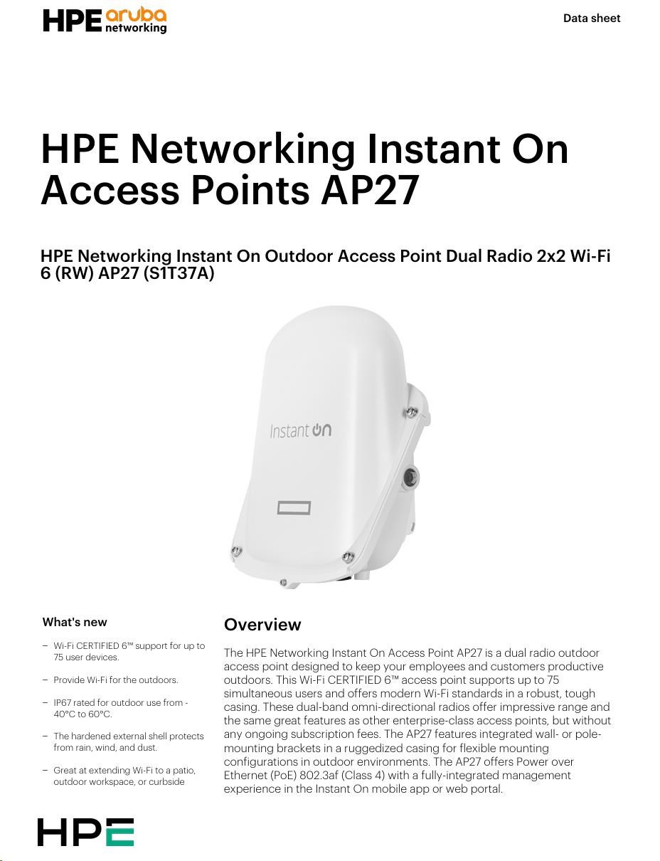 The HPE Networking Instant On Access Point AP27 is a dual radio outdoor access point designed to keep your employees and customers productive outdoors. This Wi-Fi CERTIFIED 6™ access point supports up to 75 simultaneous users and offers modern Wi-Fi standards in a robust, tough casing. These dual-band omni-directional radios offer impressive range and the same great features as other enterprise-class access points, but without any ongoing subscription fees. The AP27 features integrated wall- or pole-mounting brackets in a ruggedized casing for flexible mounting configurations in outdoor environments. The AP27 offers Power over Ethernet (PoE) 802.3af (Class 4) with a fully-integrated management experience in the Instant On mobile app or web portal.