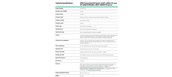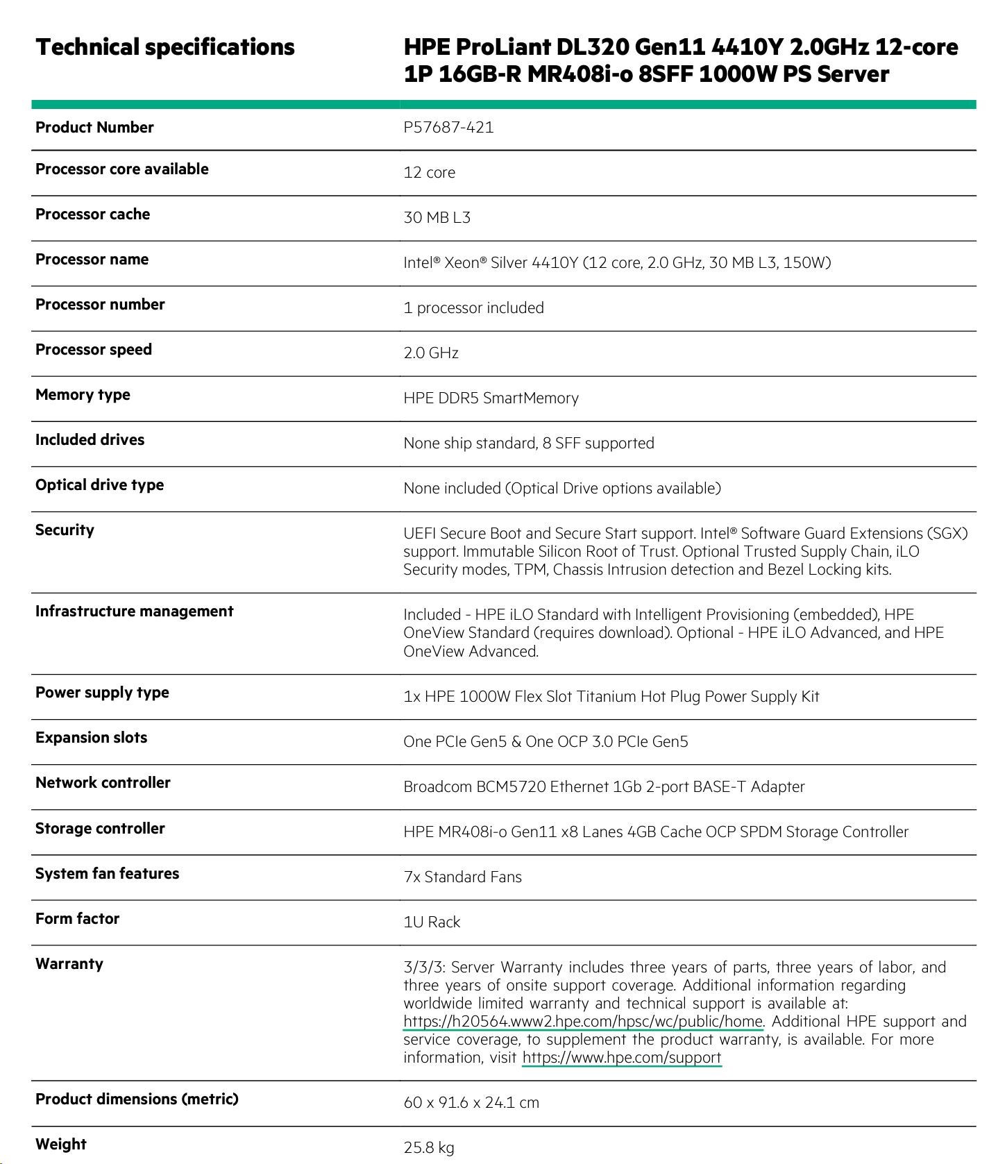 | Model Name | HPE ProLiant DL320 Gen11 4410Y 2.0GHz 12-core 1P 16GB-R MR408i-o 8SFF 1000W PS | |