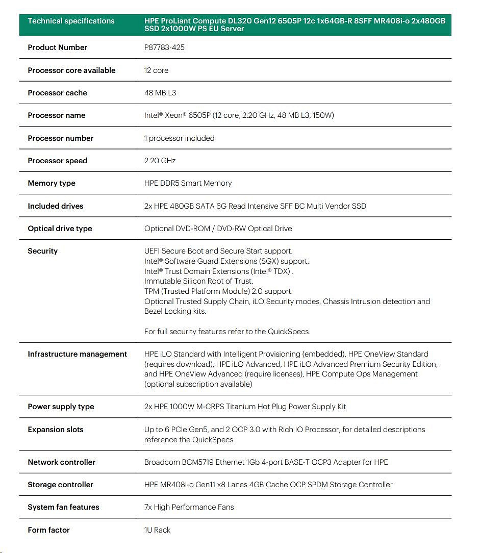 Provedení serveru:Rack, 1U Rack; Výrobce CPU:Intel; Maximální počet procesorů:1; Řada procesorů:Intel 12 Core Xeon; Model procesoru:Intel Xeon 6505P; Velikost paměti RAM (GB):128; Maximální paměťová kapacita serveru (GB):1024; Maximální počet slotů PCIe:2; Maximální počet HDD v serveru:8; Hot-plug cage pro HDD:2.5" SFF; RAID:1, 5; Redundantní zdroj.Více