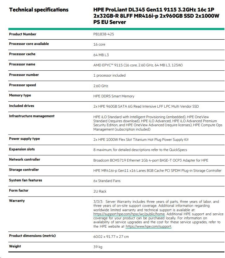 HPE PL DL345g11 AMD Epyc 9115 (2.6G/16C) 2x32G 2x960G 2x1000W MR416i-p 8LFF 4p1G Smart Choice (P81838-425)