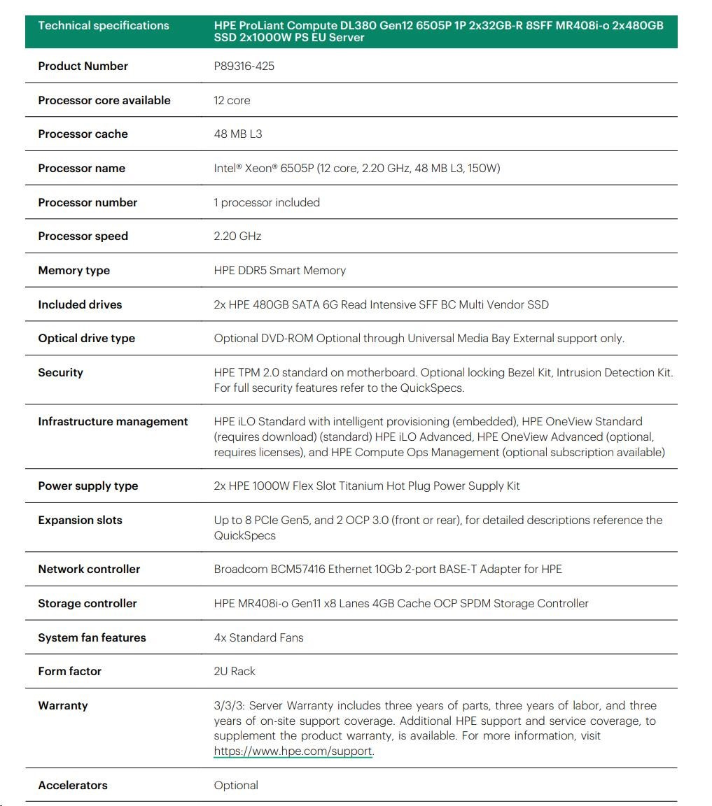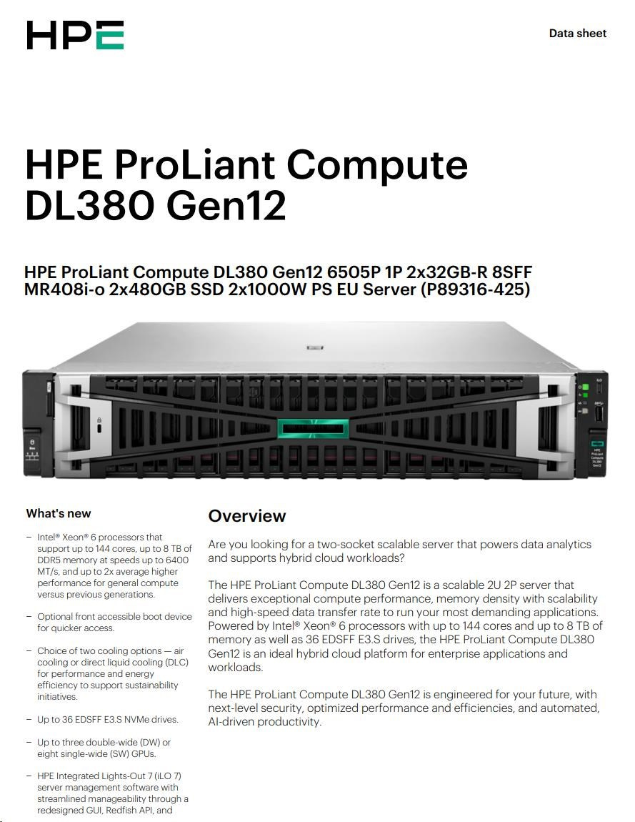 HPE PL DL380g12 6505P (2.2/12C) 2x32G (P69727) 2x480G MR408i-o 8SFF 2x1000W 10GbE NBD333 Smart Choice