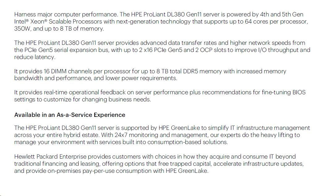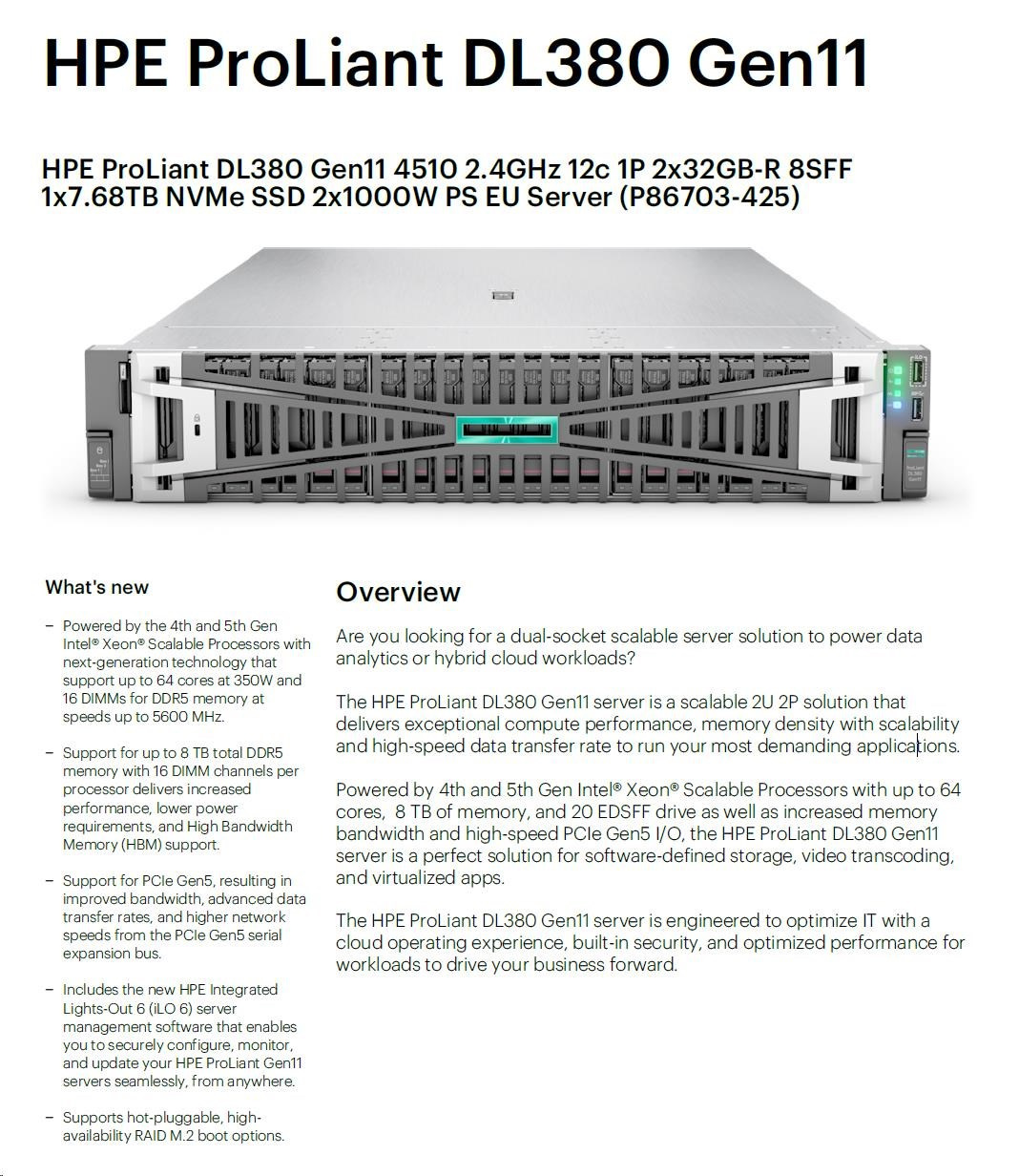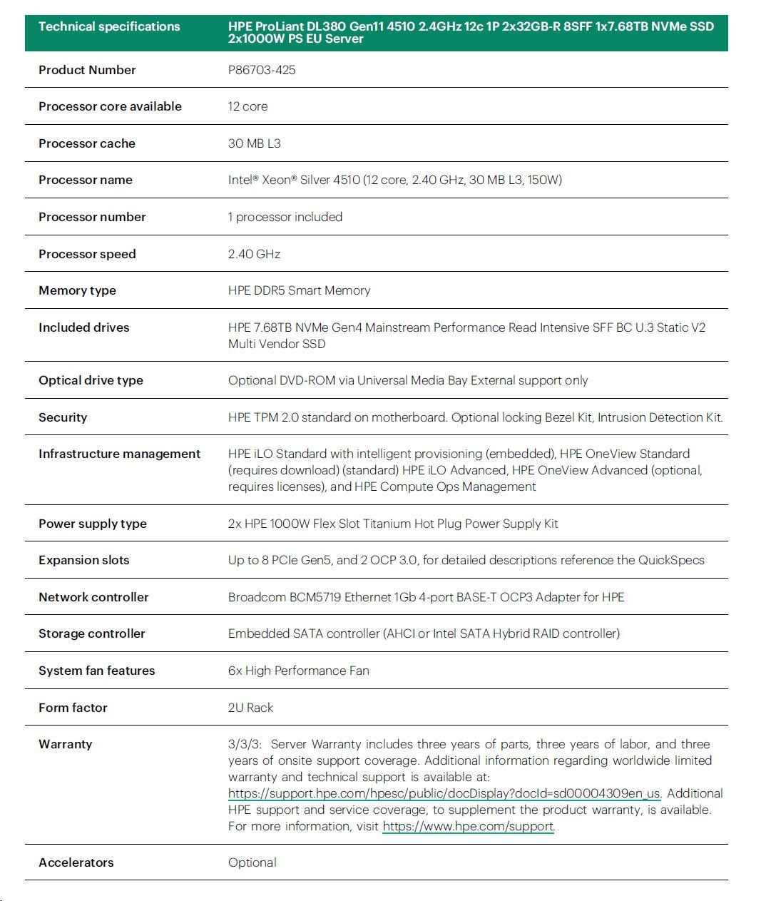 Provedení serveru:Rack, 2U Rack; Výrobce CPU:Intel; Maximální počet procesorů:2; Řada procesorů:Intel 12 Core Xeon; SSD Kapacita (GB):7.68; Model procesoru:Intel Xeon 4510; Velikost paměti RAM (GB):64; Maximální paměťová kapacita serveru (GB):6144; Maximální počet slotů PCIe:3; Maximální počet HDD v serveru:8; Hot-plug cage pro HDD:2.5" SFF.Více