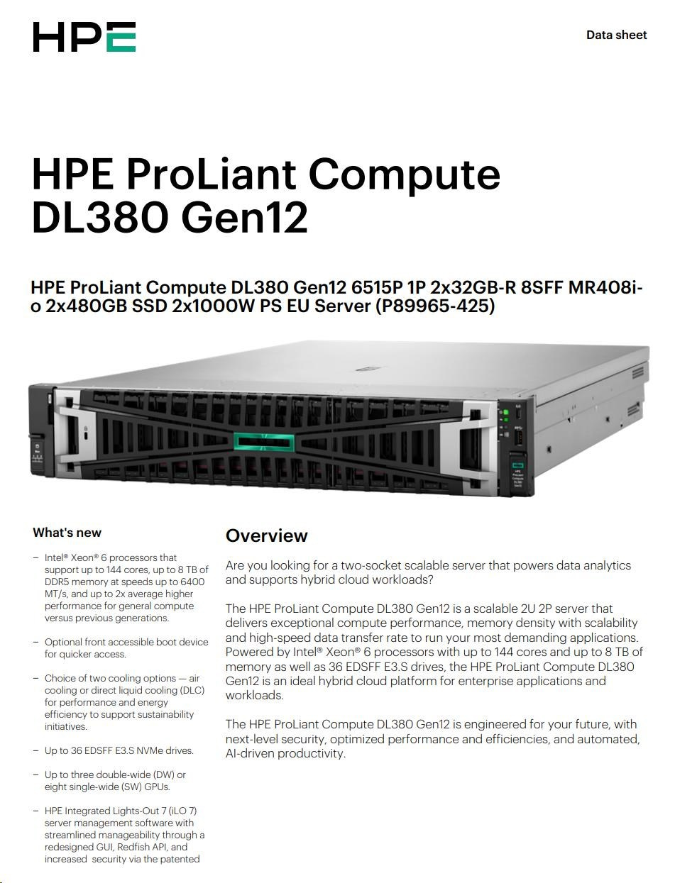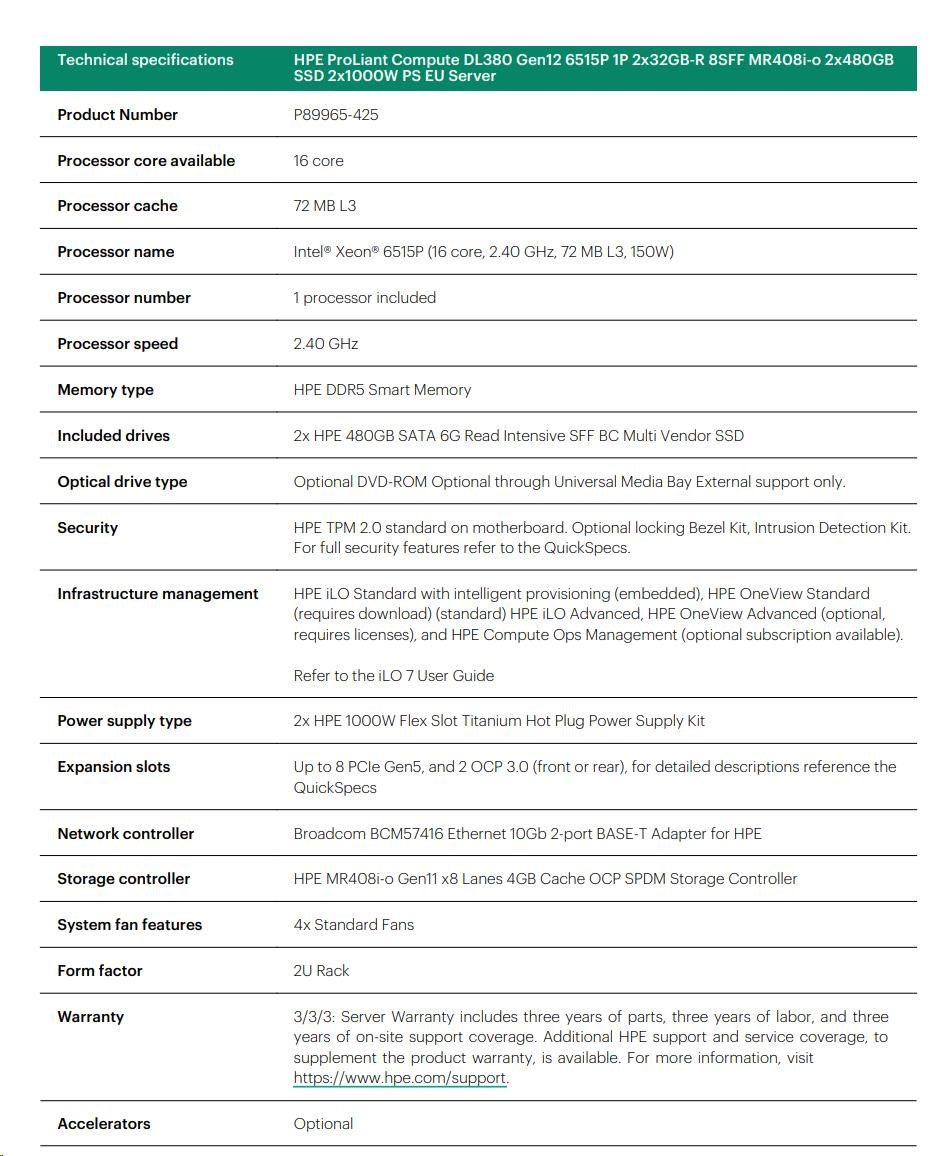 HPE PL DL380g12 6515P (2.4/16C) 2x32G (P69727) 2x480G MR408i-o 8SFF 2x1000W 2p10G-T NBD333 Smart Choice