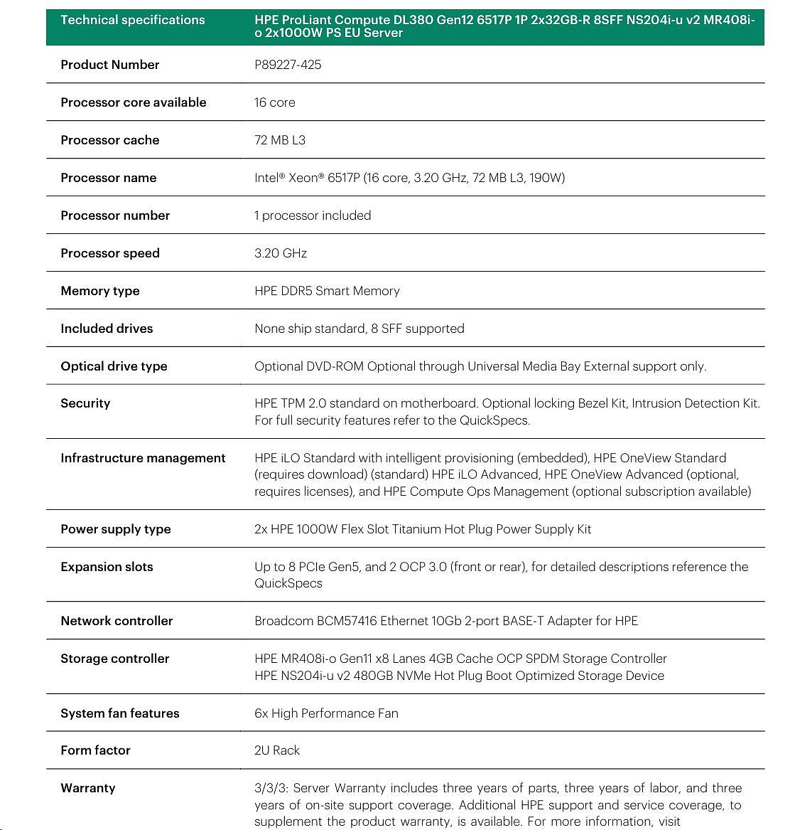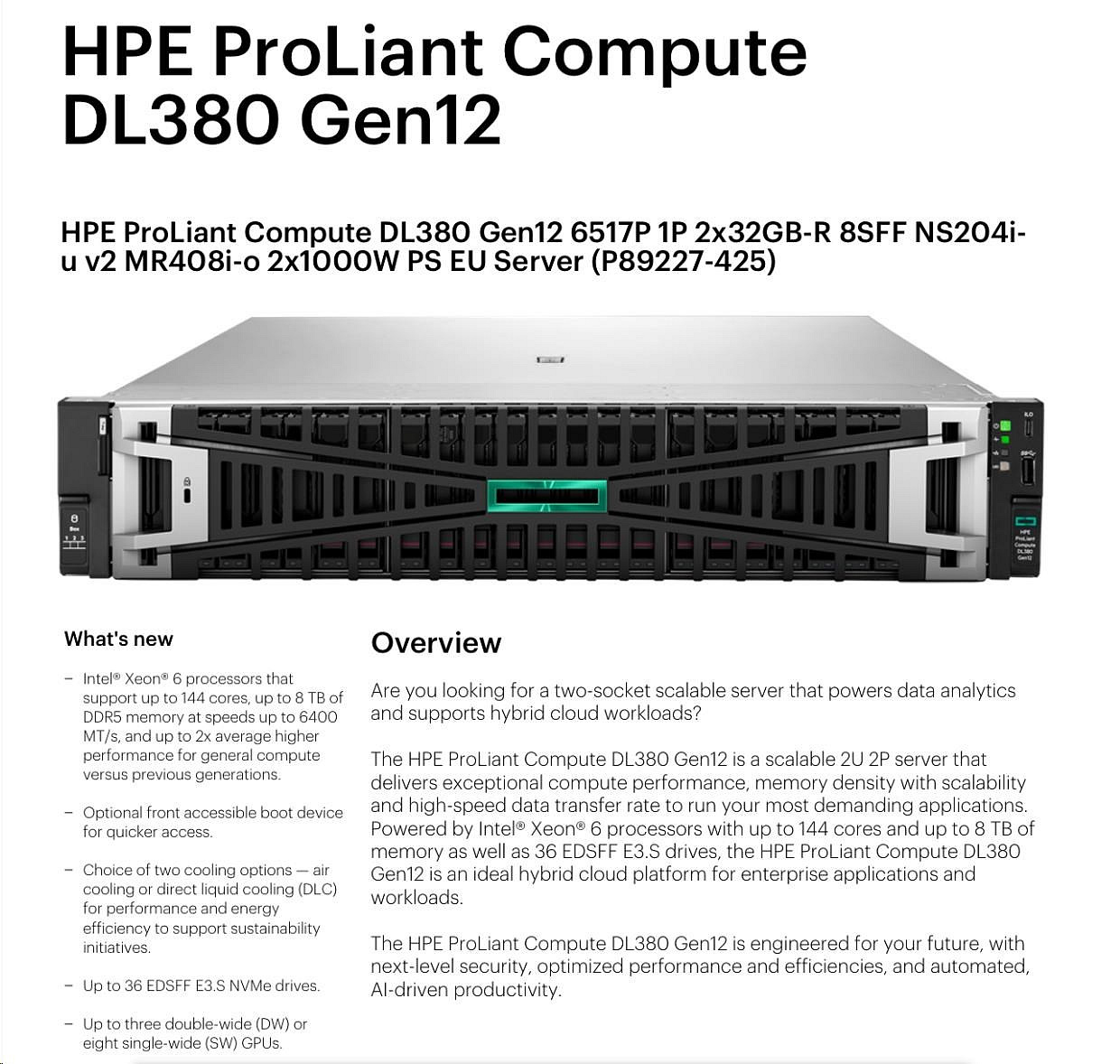 Provedení serveru:Rack, 2U Rack; Výrobce CPU:Intel; Maximální počet procesorů:2; Řada procesorů:Intel 16 Core Xeon; Model procesoru:Intel Xeon 6517P; Velikost paměti RAM (GB):64; Maximální paměťová kapacita serveru (GB):256; Maximální počet slotů PCIe:2; Maximální počet HDD v serveru:8; Hot-plug cage pro HDD:2.5" SFF; RAID:1, 5; Redundantní zdroj.Více