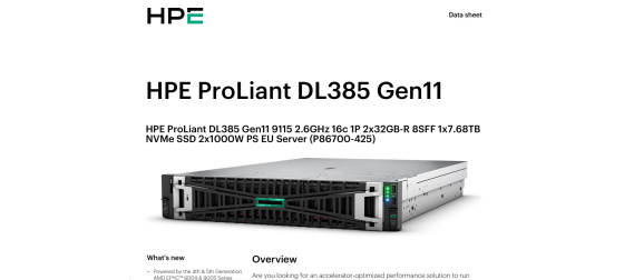 HPE PL DL385g11 AMD EPYC 9115 (2.6/16C) 2x32G (P64985) 1x7.68TB NVMe 2x1000W 8SFF 2p10GT Smart Choice